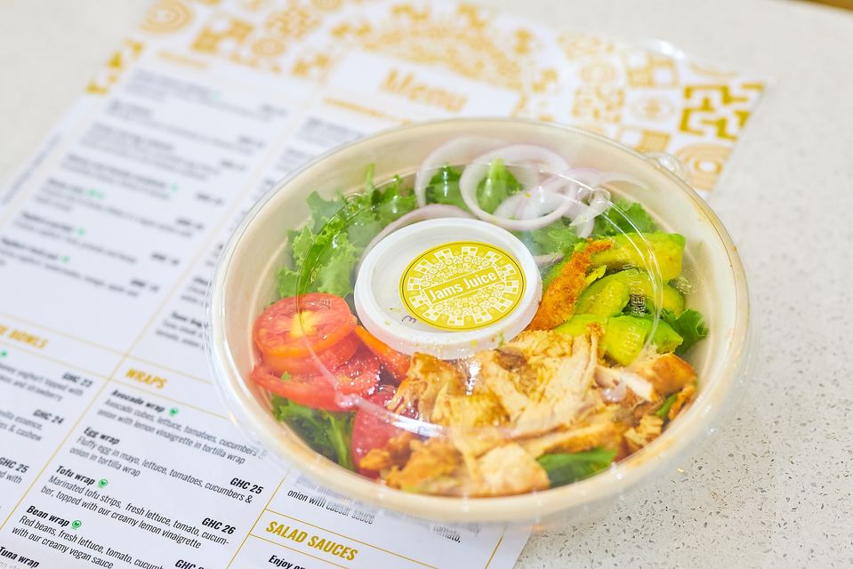Chicken, lettuce, tomatos, onions, avocado, red chilli jam